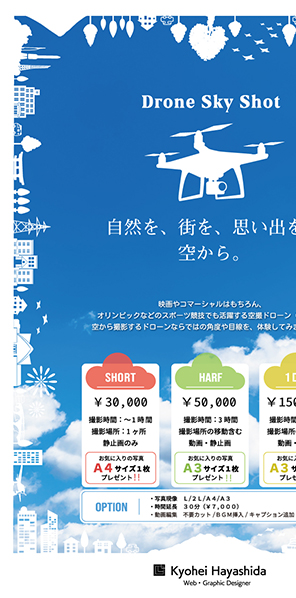 ドローン空撮サービスの販促用チラシデザイン。 Photoshop / Illustrator